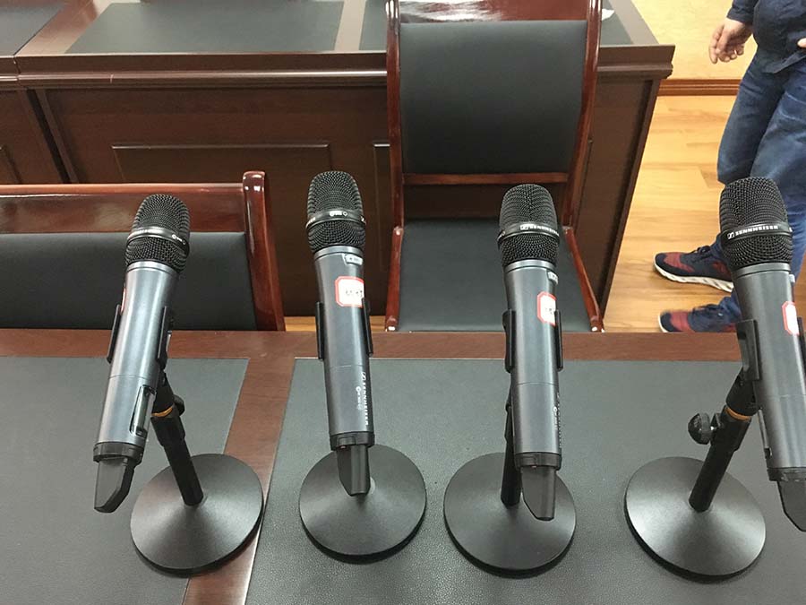 315会议室是万盛经管委会非常重要的会议室,此会议室每天都有重要会议,所以此会议室音响扩声系统选用美国BOSE(博士)音箱4只,会议系统选用德国BOSCH(博世)手拉手会议系统24只,无线话筒选用德国森海塞尔话筒8只,功放选用美国皇冠功放2台,调音台选用英国声艺,其他周边再配上赛宾反馈抑制器、DBX均衡器。该会议室所有音频扩声设备均选用的全球顶级品牌,音质良好,话筒拾音距离40-80cm。该会议室设备搭配合理,声场布局均衡,使整个会议室音响效果清晰,声音还原度极好。无杂音,无啸叫声,系统运行稳定。以下为施工完成后的照片: