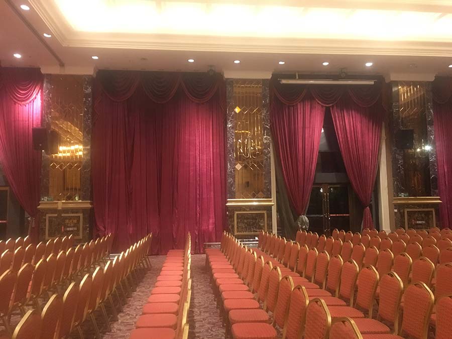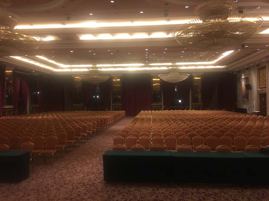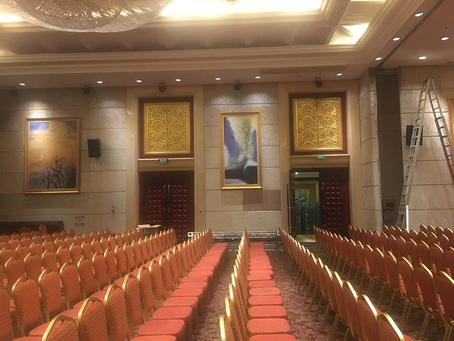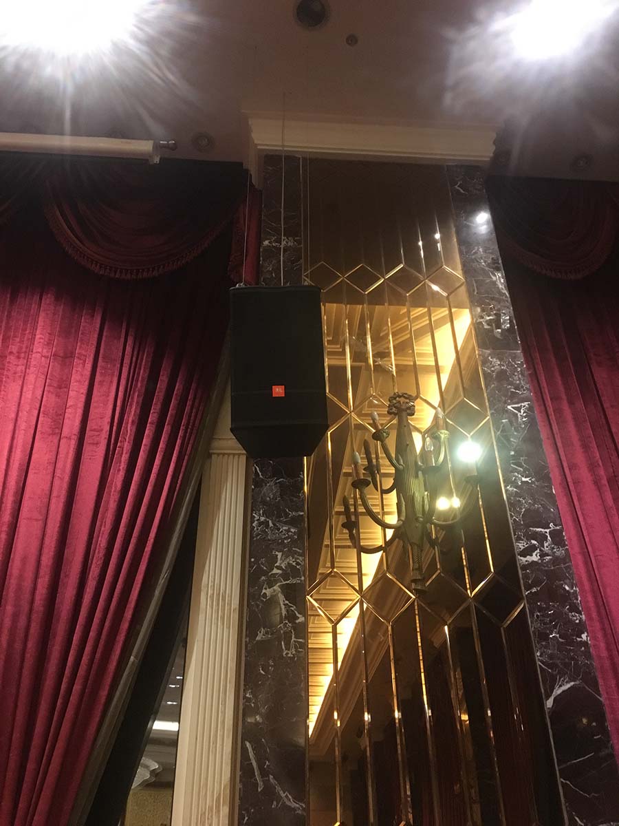 此次国际宴会厅1200平米,全部选用JBL音响,主音箱选用JBL线阵音箱,补声音箱选用JBL CV系列音箱,返听选用PRX400系列音箱。功放选用皇冠CROWN功放,BSS处理器以及莱斯康效果器,声艺调音台。