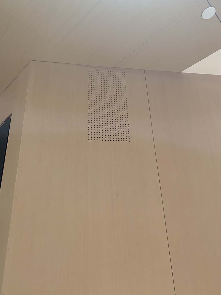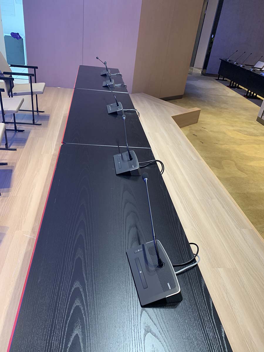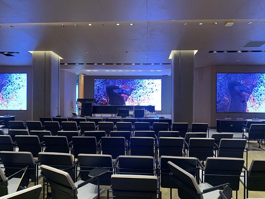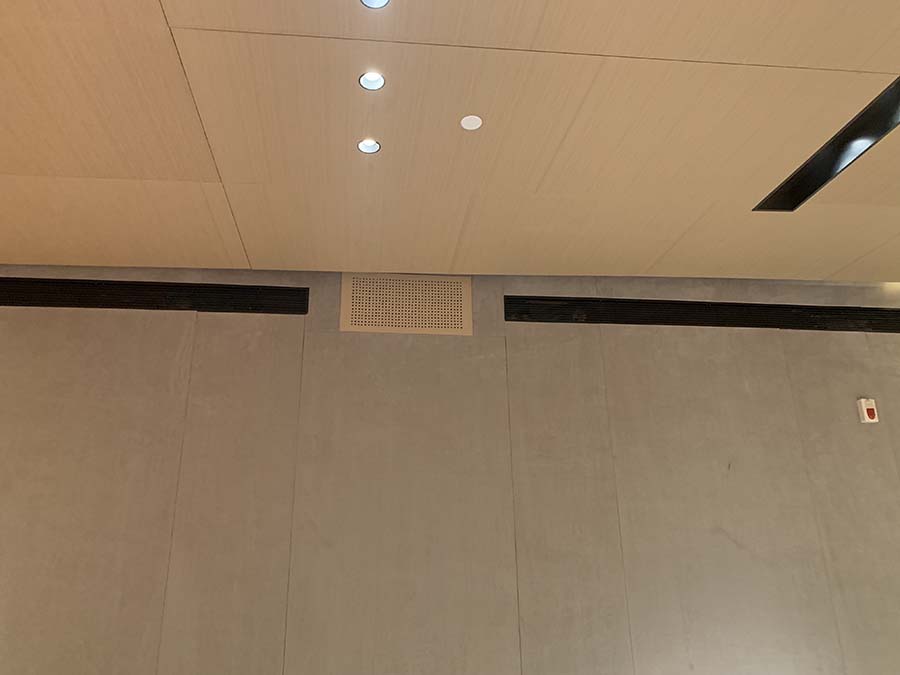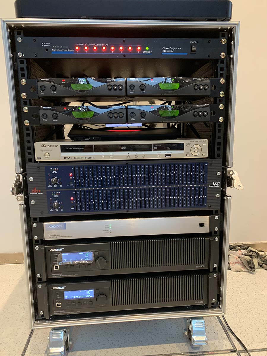重庆中瑞产业园会议室音响扩声系统及视频显示系统由我公司负责设计、施工及维护。该会议室选用美国bose音响Bose F1 Model 812 可调指向性阵列扬声器作为前置主扩声音箱,BoseRoomMatchRMU208 多用途扬声器作为后场补声音箱。功放选用BosePowerMatchPM8500可配置专业功率放大器,处理选用Bose?ControlSpace?ESP-880处理器,传声器选用西班牙televic手拉手会议系统及AKG无线话筒,调音台选用英国Soundcraft声艺Signature 16调音台。显示屏选用P2.5室内全彩显示屏。我公司为精信中心会议室扩声系统提供音乐会品质的声音和高水平的可扩展性和可配置性。音箱全采用隐藏式安装。以下是现场施工照片。
