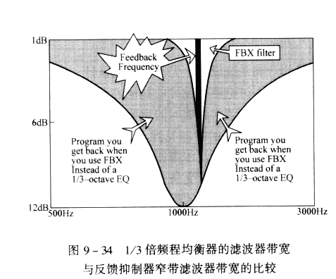 目前很多扩声系统中配置有一种称为反馈抑制器的设备,反馈抑制器首先由美国的赛宾公司研制出来,目前已有不少公司推出了相似功能的反馈抑制设备,甚至在新投放市场的数字音频系统,例如数字媒体矩阵等设备中已经包含了反馈抑制器的功能,赛宾的反馈抑制器能根据萧叫形成的机理,自动找到啸叫频率点,并且自动生成窄带滤波器,降低以此频率为中心的窄频带增益,从而破坏幅度平衡条件,达到使闭环放大倍数小于1的目的,使振荡不能形成,这种反馈抑制器设置有两种宽度的窄带滤波器,一种为1/5倍频程带宽,一种为1/10倍频程带宽,无论是1/5倍频程带宽还是1/10倍频程带宽都远远比1/3倍频程带宽小得多,所以对音质的影响也远远比用1/3倍频程均衡器抑制啸叫小得多,而且原则上说在1/3倍频程带宽内出现梳状滤波器效应,听感上是听不出来的,其与用1/3倍频程均衡器抑制啸叫的影响比较可以看图9-34和图9-35。