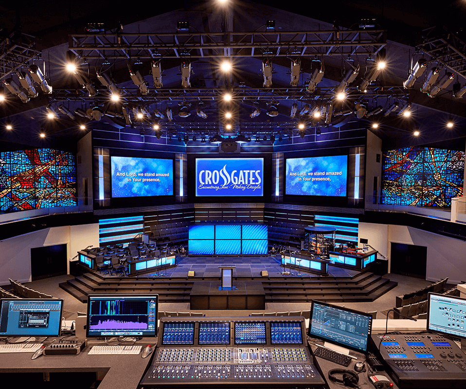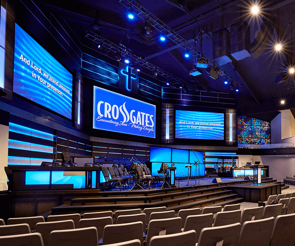 该工程采用了一块强力巨彩8.6㎡的Q1.2大屏,左右两边各配置了一只EAJAX 采用DANTE接口的双6寸POE音箱,整... -